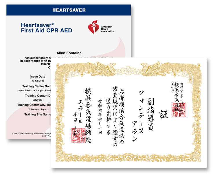 級位・段位の審査は当道場内で行われます。証明書は公益財団法人合気会が発行し、道主の署名が入っています。彼らは世界中で認められています。